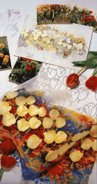 PAINTING FLOWERS - Mandy Southan There are lots of different ways of approaching flower painting on silk. Here are just some of them. Working from photographs Some flower painters like to work from photographs because flowers move and change as you paint them, and sometimes wither before the painting is finished. Photographs can also provide plenty of inspiration during the winter months, when there not so many flowers around to paint. You can find beautiful photographs in gardening books and flower catalogues, or better still, take your own. This way you will have had the chance to study the real flowers and therefore have a deeper understanding of their growth and structure.